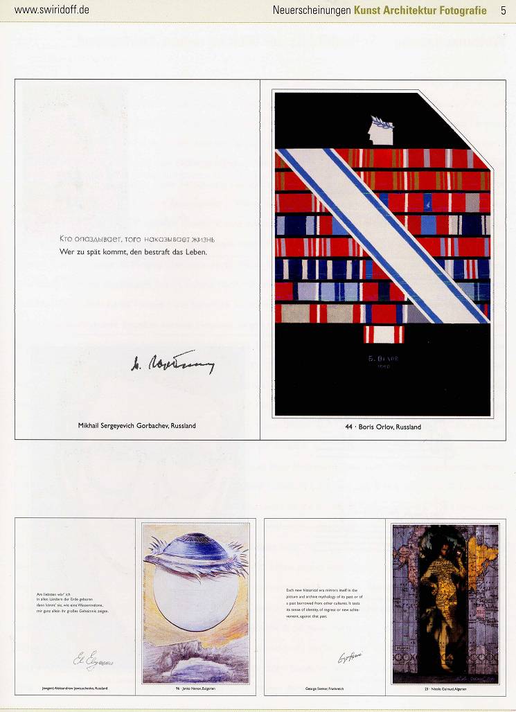 Per tutte queste ragioni abbiamo voluto (Artero, Eubel e Pfeiffer e io) proporre a eminenti artisti, poeti e filosofi di tutti i continenti un atto simbolico forte e collettivo: ridisegnare il planisfero del mondo con immagini e parole che partono dalla riflessione su se stessi (l’autoritratto, perché per cambiare il mondo bisogna partire da se stessi), si aprono a una relazione creativa con l’altro (non conflittuale o economica) e complessivamente propongono una visione molteplice e interdipendente del mondo (non totalizzante e unilaterale, perché quest’opera collettiva è fatta mantenendo e valorizzando le identità individuali e culturali) per il nuovo millennio. Una visione insieme ironica, drammatica, riflessiva, sensibile, provocatoria, vitale.... Un’opera collettiva, dove la creatività artistica è segno emblematico di un’alternativa possibile alla logica distruttiva del conflitto, dell’intolleranza, del profitto a ogni costo e della devastazione ecologica. Un atlante utopico del nostro tempo che idealmente abbraccia l’intero pianeta e che vuole restituire all’arte, alle arti, la sua funzione storica di avamposto intuitivo, sensibile, profetico, poliedrico, dinamico e pacifico dell’immaginario collettivo.
