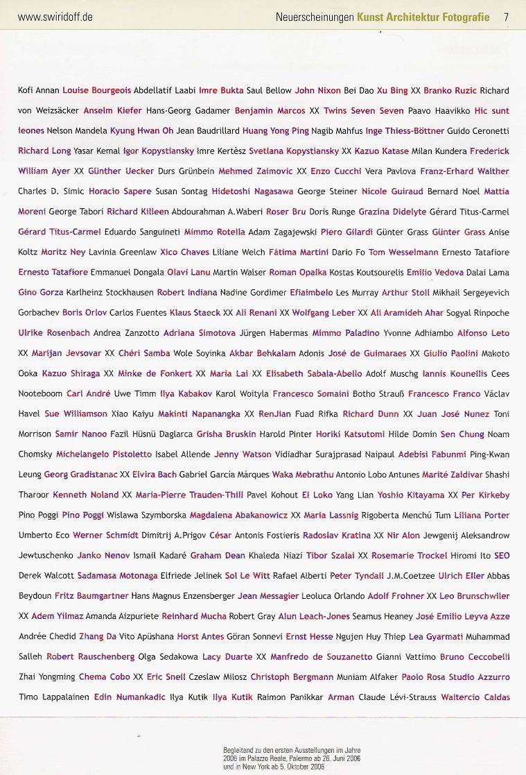 2006 Presentazione del volume (Swirdoff editore) e del Planisfero Palazzo dei Normanni e nuovo Museo d’arte contemporanea di Palermo, in attesa della presentazione internazionale che si svolgerà a dicembre a New York al Palazzo dell’Onu e al Moma